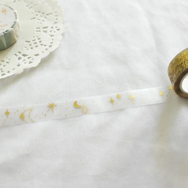 Night Shimmer – a matt transparent tape featuring a starry scene in beautiful gold foil. This tape could be used as is or it could be placed on top of some washi tape to create a gold foil washi tape effect. Please note the adhesive on this tape is perfect for journalling / decorating but it is not sticky enough to wrap parcels etc.