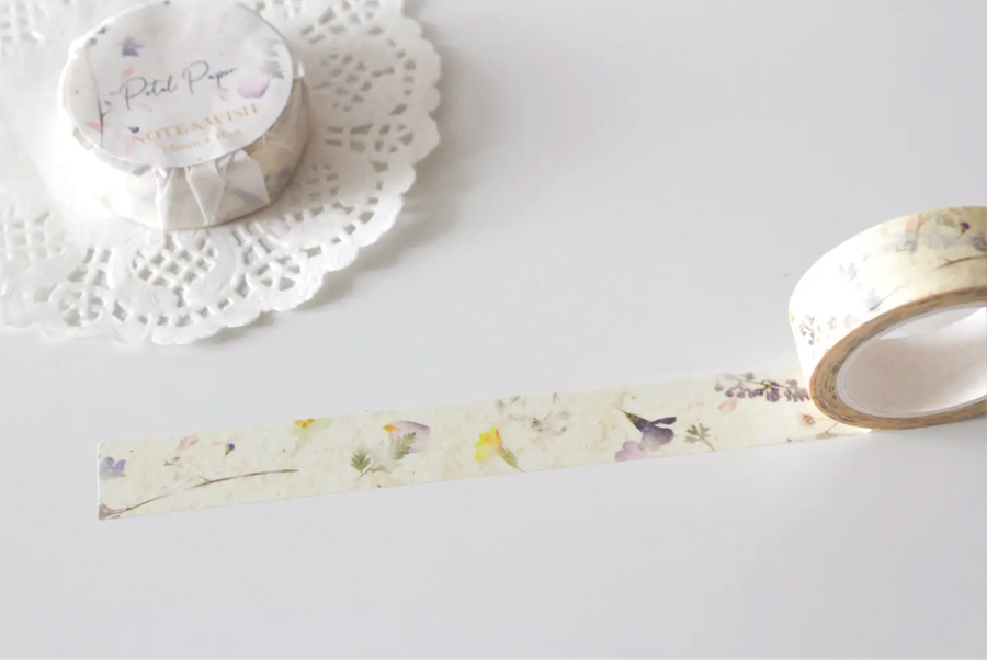 Dit prachtige washi-tape met delicate bloemblaadjes is voorzien van scans van echte geperste bloemen. Elke rol washi-tape is 10m lang en 15 mm breed en is verpakt in wit milieuvriendelijk papier met één sticker. Ontwerp: Petal Paper Afmeting: 15 mm x 10 m